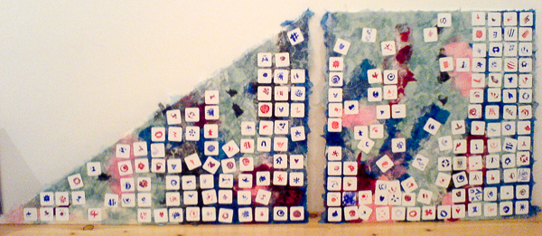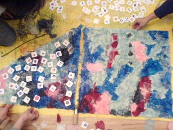 Jedes Kind fertigte einen Stempel mit seinem ganz persönlichen Signet an. Gedruckt auf kleinen Kärtchen entstand so eine Vielzahl an unterschiedlichen Motiven, die all gemeinsam Platz auf dem "AWO-Bild" fanden. Die Anordnung der verschiedenen Kärtchen auf der großen Fläche soll die Vielfalt der Individuen und das persönliche Miteinander widerspiegeln. Und so wundert es nicht, dass manche Kärtchen sich scheinbar mühelos einreihen, während andere den Eindruck erwecken, davon zu hüpfen oder wieder andere einfach nur ein wenig Abstand zum Nachbarn benötigen. Als Gesamtkompostion präsentiert sich das Kunstwerk als ein abgestimmtes Bild, das beim Betrachter Interesse weckt und ein harmonisches Miteinander vermittelt. "So, als hätten sich die Kinder mit ihren Kärtchen auf dem Boden zum gemeinsamen Spiel versammelt und jeder konnte sich ganz entfalten", sagte Martina Frick, Kursleiterin und Kustpädagogin an der Schule der Fantasie und hofft, dass es zukünftig den zahlreichen großten und kleinen Besuchern der Beratungsstelle für Eltern, Kinder und Jugentliche in Planegg beim Bestaunen des Kunstwerkes ähnlich ergeht.